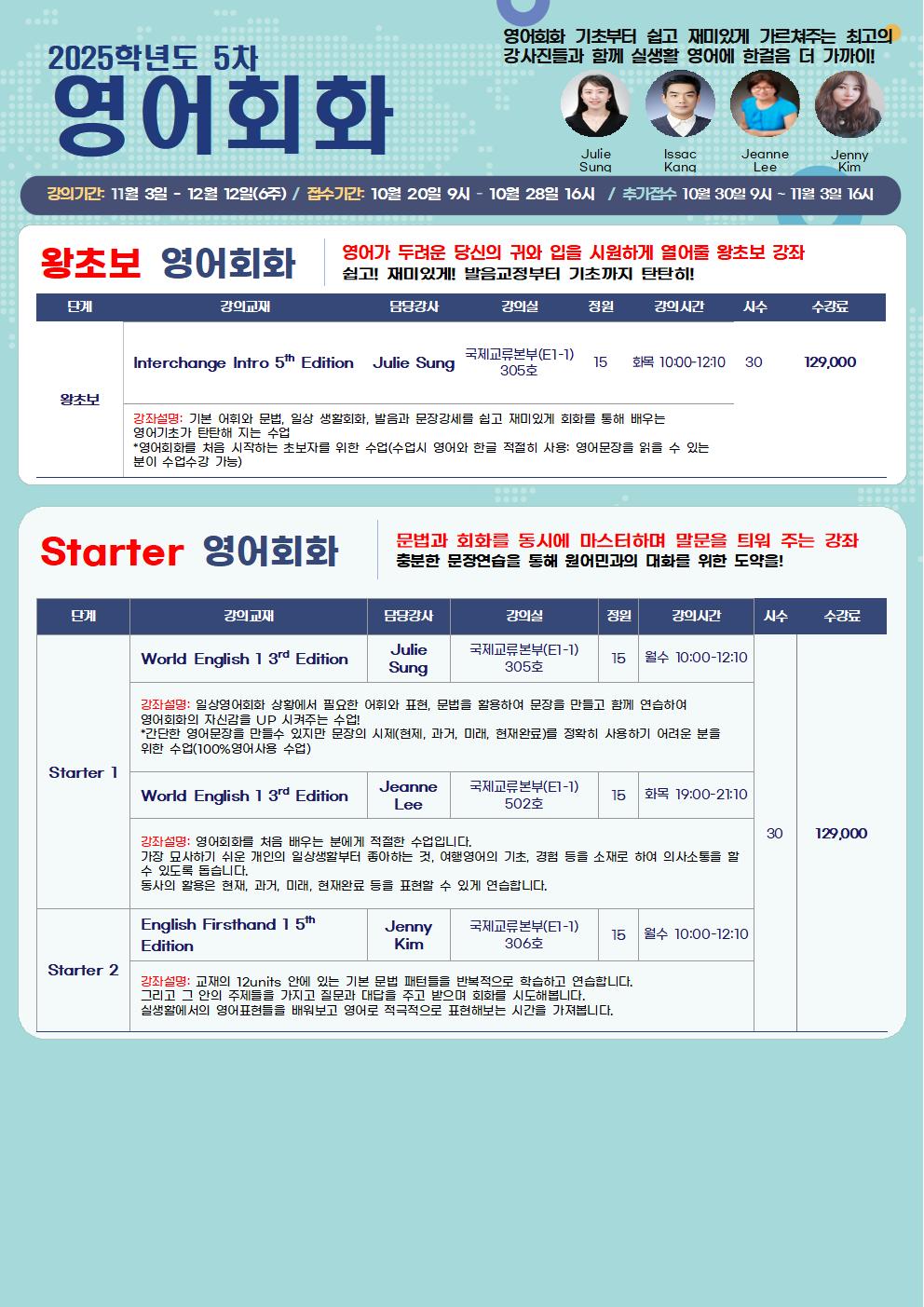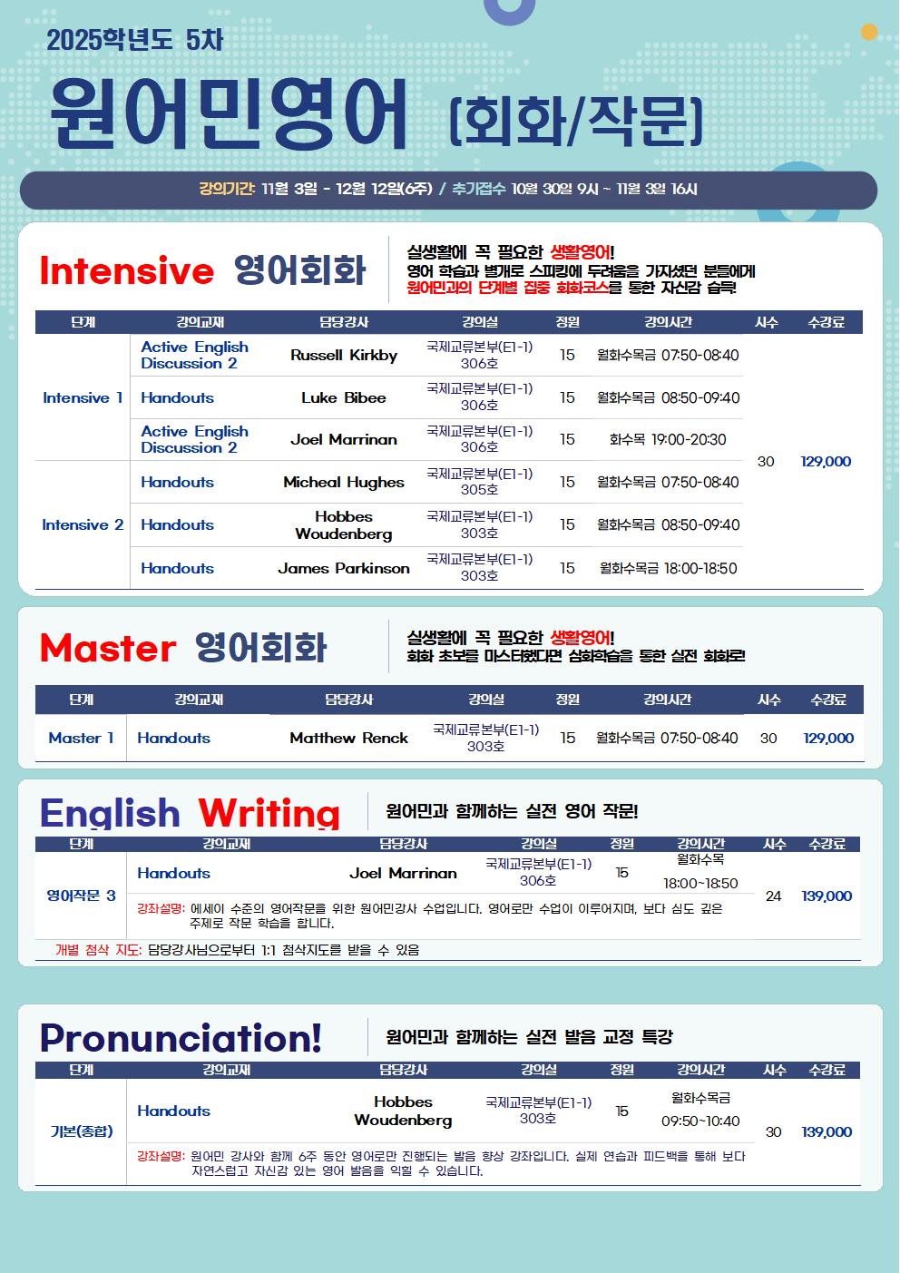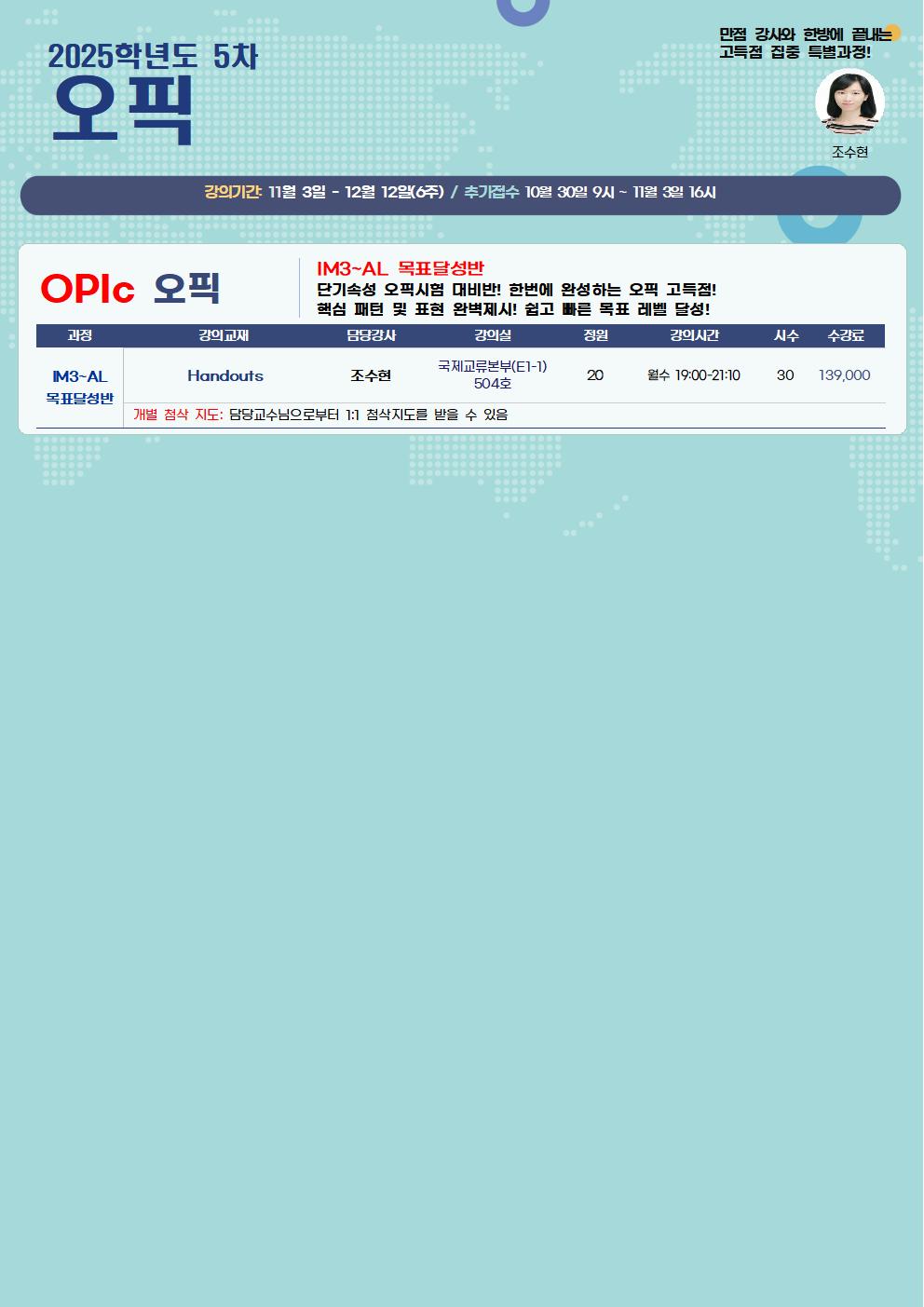 2025학년도 5차 외국어특강 추가접수 안내 기간: 2025. 10. 30.(목) 9:00 ~ 2025. 11. 3.(월) 16:00 *정원 내 잔여석에 한하여 실시됩니다. 정원을 초과하여 신청할 수 없습니다.
