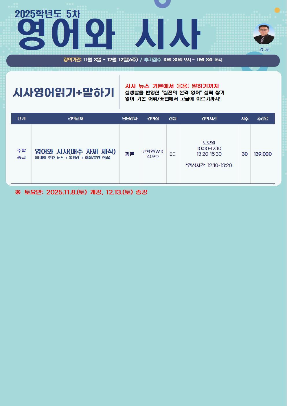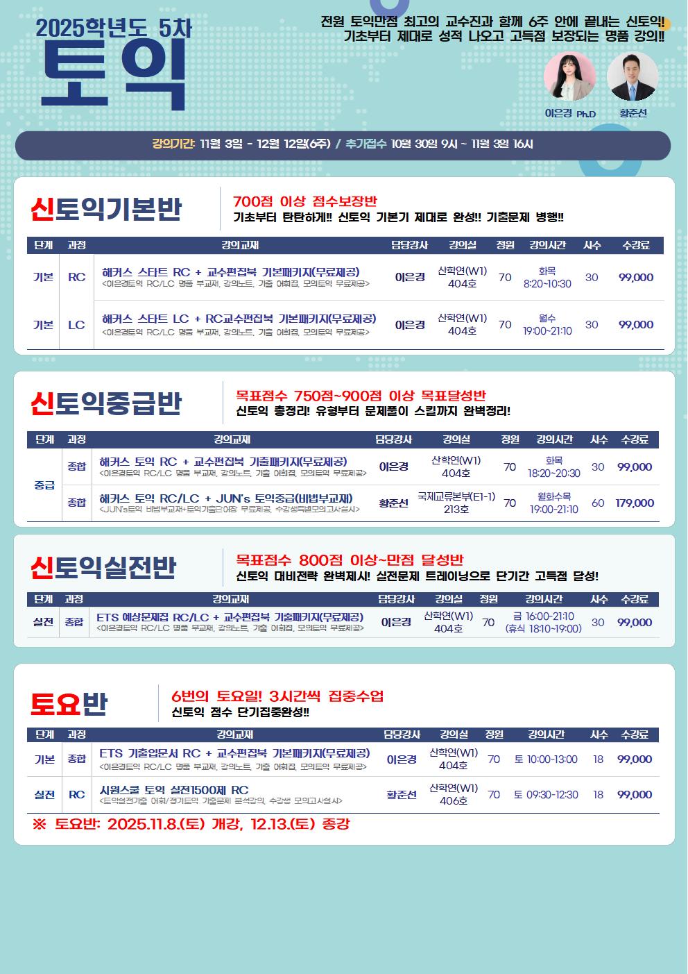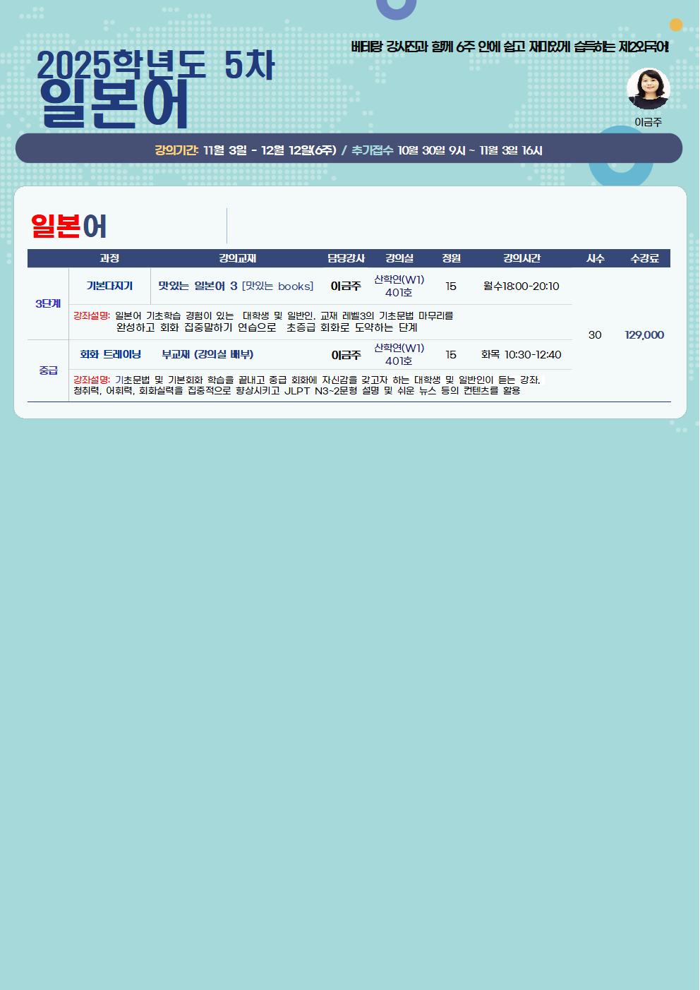 2025학년도 5차 외국어특강 추가접수 안내 기간: 2025. 10. 30.(목) 9:00 ~ 2025. 11. 3.(월) 16:00 *정원 내 잔여석에 한하여 실시됩니다. 정원을 초과하여 신청할 수 없습니다.