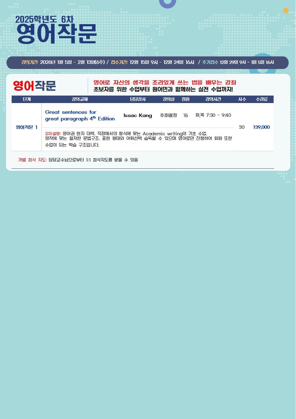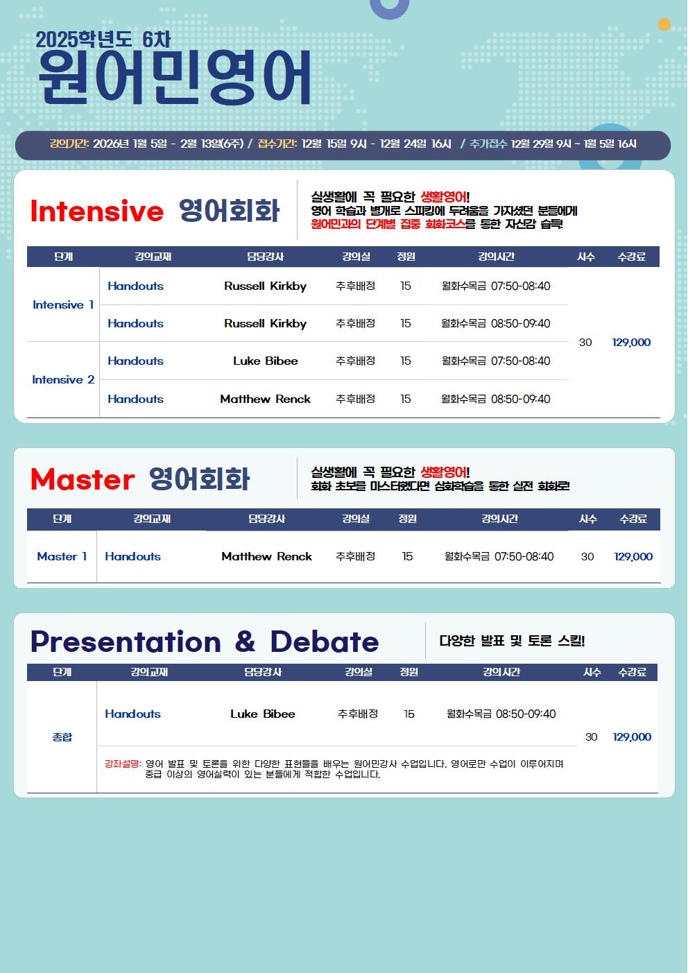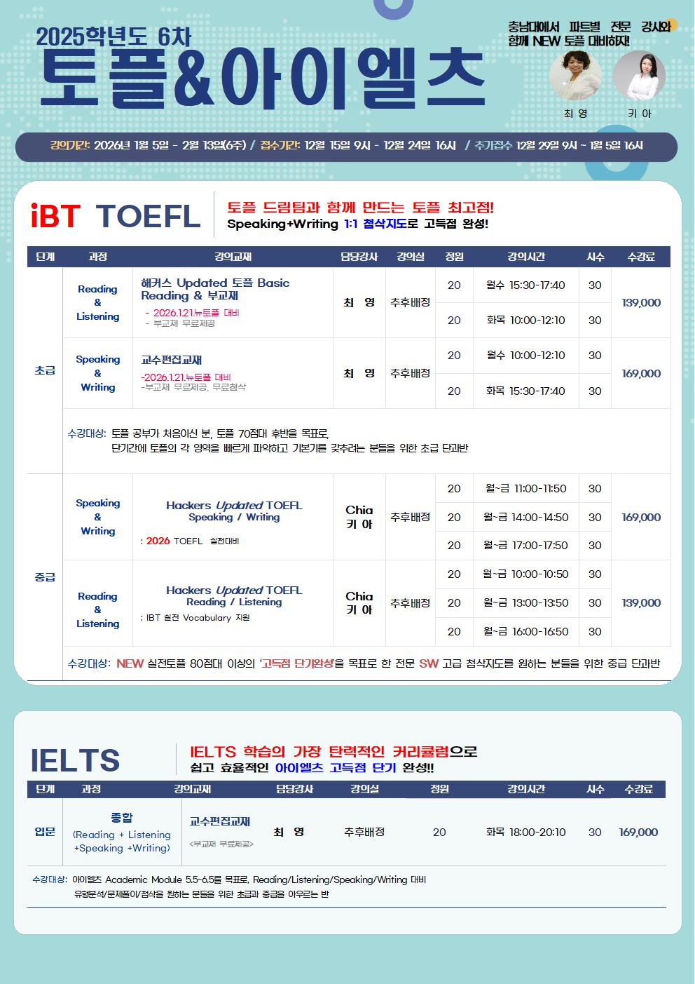 2025-6차 외국어특강 시간표 및 일정 안내드립니다. 최초접수기간: 2025. 12. 15.(월) 9:00 ~ 12. 24.(수) 16:00 추가접수기간: 2025. 12. 29.(월) 9:00 ~ 2026. 1. 5.(월) 16:00 *최초접수 마감인 2025. 12. 24.(수) 16:00부터 추가접수 시작 2025. 12. 29.(월) 9:00 까지는 접수가 불가합니다. *최초접수 마감시각을 기준하여 최소 수강인원이 미달된 과목들에 대하여 폐강됨을 미리 안내드립니다.